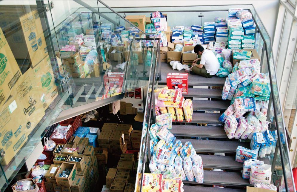 取材班がこの避難所を訪れたのは4月16日の本震から6日がたった22日。「避難所は物資不足」「1時間並んでやっとおにぎり1個」などの新聞報道に接していたため、現地で目にした光景とのギャップに驚かされた。避難所には水や食料などの物資を入れたダンボールが想像以上に届いていた。通路には飲料の他、紙おむつなどの物資が所狭しと並べられている。