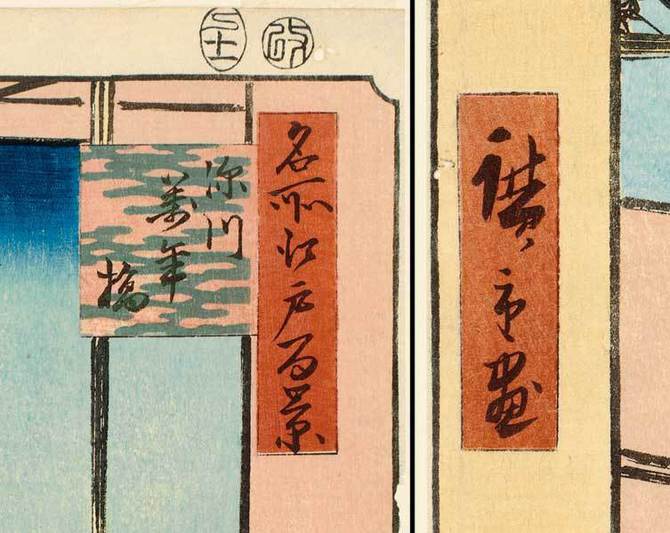 一見、窓の外に見える大川(隅田川)越しの遠景に富士山が、手前には宙に浮かんでいるような亀が描かれています(②)。この窓枠のように見えているのは、右側と下(左右逆のL字型)のピンク色は橋の欄干、そして左側と上のベージュ色は手桶の持ち手です。亀といえば萬年、その名を冠する深川萬年橋に描かれた通称「吊るし亀」は、実は手桶の持ち手からぶら下げられている亀のことです。亀が見ているのは、西の方角にある江戸の町、そしてその先の富士山です。