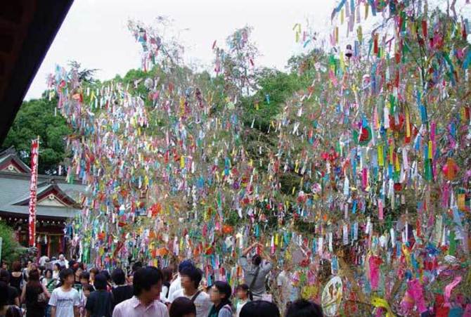 笹飾りの竹は40本ほど用意され、七夕の日にちなみ、7・7メートルの高さに切りそろえられる。東西2つの参道に露店が軒を連ね、2日とも17時30分を過ぎたころに賑わいのピークを迎える。願い事を書く短冊は境内で授与、奉納される。参拝できない人のために、祭りの1カ月前から発送も受け付けており、願いを書いた短冊が全国から送られてくるそうだ。