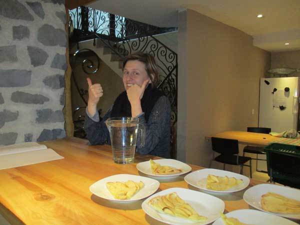 Sauguesの巡礼宿も節約のため素泊まり(12ユーロ)とした。食堂のテーブルの端に座り、持参したサラミとチーズとパンで簡単な夕食をしようと準備していたら料理人の女性が親切にもスープを持ってきてくれた。