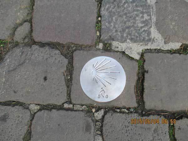 石畳の歩道に埋め込まれたホタテ貝マークの案内表示(貝の開くほう、すなわち右がサンチアゴ方面であることを示す)