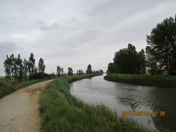 Poblacion de Camposに向かう途中の運河(カナル)に沿って霧雨の巡礼道を行く