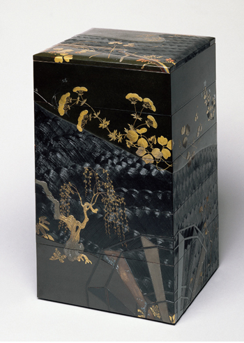 安村氏:なんといってもデザインが洒落ていること。もう1つは、“だまし絵”的な面白さがあるところですね。青海波〔せいかいは〕塗、紫檀〔したん〕塗、青銅塗など、いわゆる“変塗〔かわりぬり〕”を駆使して、人の目を錯覚させ、混乱させる。当館(板橋区立美術館)所蔵の漆絵「花瓶梅図漆絵」も、紫檀の板に描いているように見ますが、紫檀塗という技法で紙に描かれたものです。花瓶の下敷は石の台のように見えますが、これも漆で描いたもの。エドソンコレクションの「柳に水車文重箱」は、水車の羽1枚1枚が全部、変塗なんです。ほんとうは5枚全部同じ塗で問題ないのに、あの人は1枚ずつ塗を変えるんです。普通の人には違いがわからないのにね。一生懸命苦労して描いているのに、それをわざと見せないようにしている。