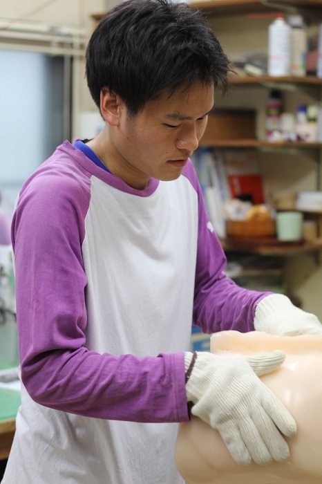 装具製作中の野口さん。(有)坂井製作所にて