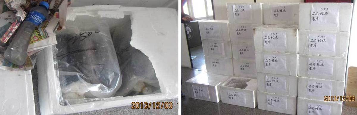 2011年12月、台湾の桃園国際空港で香港行きの航空機に搭乗予定の乗客のスーツケースから押収された2万匹のシラス(写真・TAIWAN FISHERIES AGENCY)