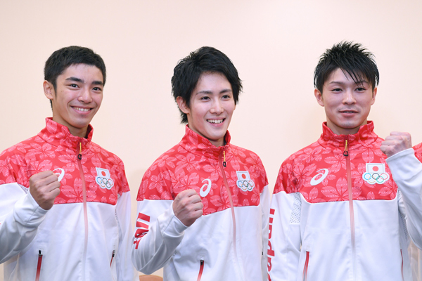 リオ五輪・体操男子日本代表の出発会見。左から白井健三選手、加藤凌平選手、内村航平選手(写真:アフロスポーツ)