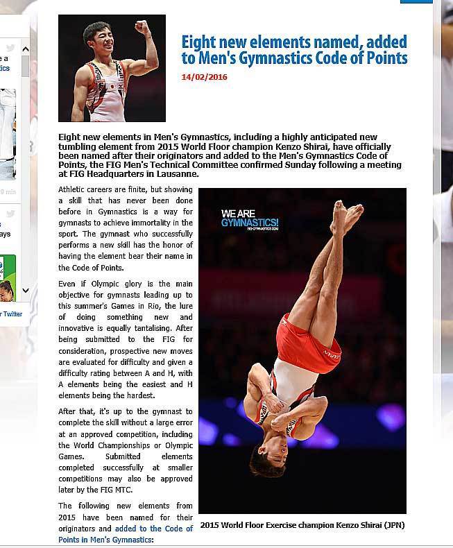 新しい体操の技の命名を発表した国際体操連盟のホームページの記事。シライ3ほか2人の日本人名がつく技も認定された。(国際体操連盟HPから)