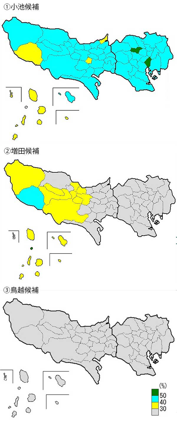 実際、主要候補3氏の市区町村別の得票率の状況を図2により見てみると、62市区町村中、小池氏が55市区町村で勝利する一方(緑色)、増田氏は7市町村(水色)、鳥越氏に至っては勝利できた市区町村はなかった。