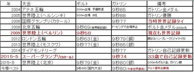 まずは、図2のボルトとガトリンの過去の成績を見て欲しい。