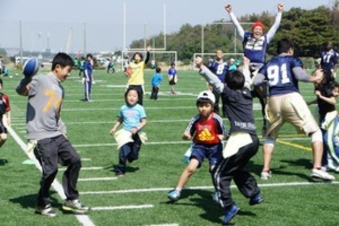 秋津で2001年に発足の習志野ベイサイドスポーツクラブ(NBS)の新種目:フラッグフットボール。社会人のアメフトチーム「オービックシーガルズ」と協働しての多世代が楽しく汗を流す。