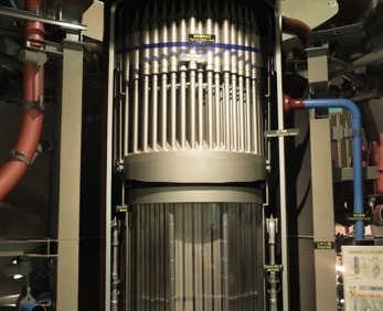 原子炉内模型。上が燃料棒、下が制御棒。制御する時は、下の制御棒が持ち上がり、上の燃料棒の間に入る。