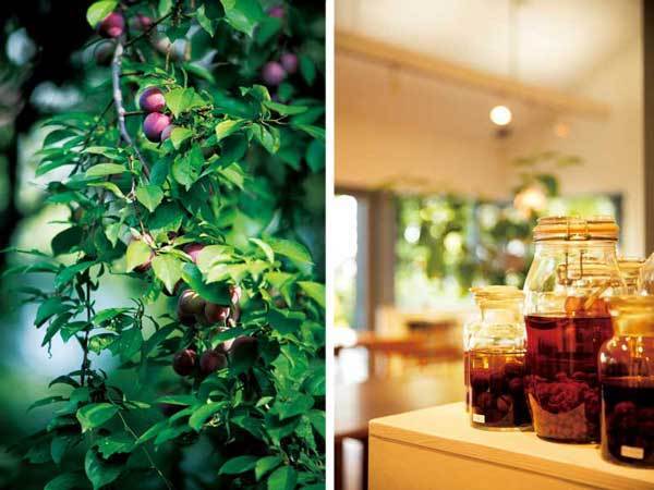 (写真左)さまざまな果実が森を彩る (写真右)果実酒の瓶が並ぶ「なず菜」の店内