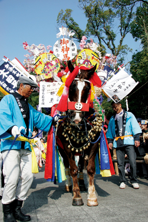 馬の首には100個近い鈴が掛けられており、鞍には米俵を乗せて、五色の布、花、初鼓などを飾る。こうした豪華な飾りつけも見どころの1つだ。