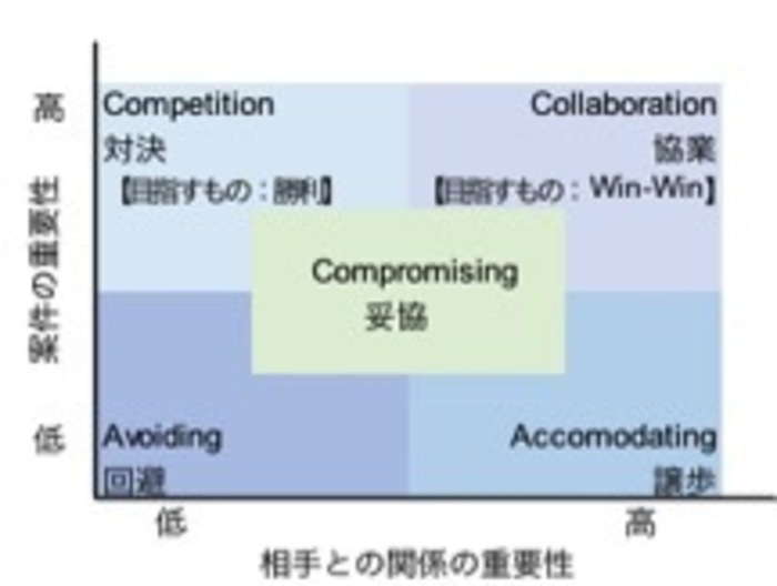 さて、ネゴシエーション・交渉と聞いてどのようなイメージを持つだろうか。TPPや従軍慰安婦問題の報道などでハードネゴという言葉がよく使われるが、非常にタフな現場を想像させる。だが我々は日常生活において、友人や同僚、時には家族に対してでも様々な事柄を相談・議論したり、その結果、相手に何かを譲ったり譲られたりしていないだろうか。実はそれらは広義のネゴシエーションをして、それに基づいた行動を取っているのである。相手との関係と案件の重要性を軸に、どのような行動を取るかをマトリックスに表すと次のようになる。