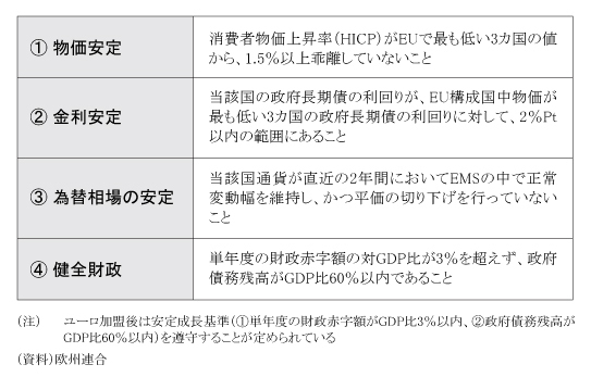そもそも、EU加盟国が単一通貨ユーロを導入する場合には、物価や財政赤字などが健全な水準にあることが前提となっている。ユーロ圏各国が一致して安定した通貨価値を維持することが不可欠だからだ。だから、ユーロ圏に参加する際には、物価安定、金利安定、為替相場の安定、健全財政の基準が満たされることが決められている(図表1)。また、ユーロ圏参加後も、単年度の財政赤字額がGDP比3%以内、政府債務残高がGDP比60%以内、を遵守することが決められている。