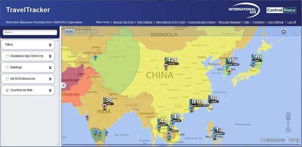 企業がグローバル化すればするほど海外出張社員は増えてくるが、有事の際の安否確認は難しい。売上高の6割以上・従業員の約7割が海外であるオムロン。同社は、旅券情報から出張社員が「今どこにいるか」を地図上で把握できるITシステム「トラベルトラッカー」(インターナショナルSOSジャパン提供)を導入している。社員がどこの空港にチェックインしたかという情報までリアルタイムで分かる。「グローバルでは年間約1万5000件の出張がある中、海外リスクが増えてきていることを受け、社員の安否確認には注力している」(グローバル総務部の櫛田昌徳氏)。バングラデシュやフランスのテロの際も、出張者の所在が即座に把握でき、メールや電話によって安否も確認できたという。セキュリティ対策を現地任せにするのではなく、本社が責任を負う体制を作っている。