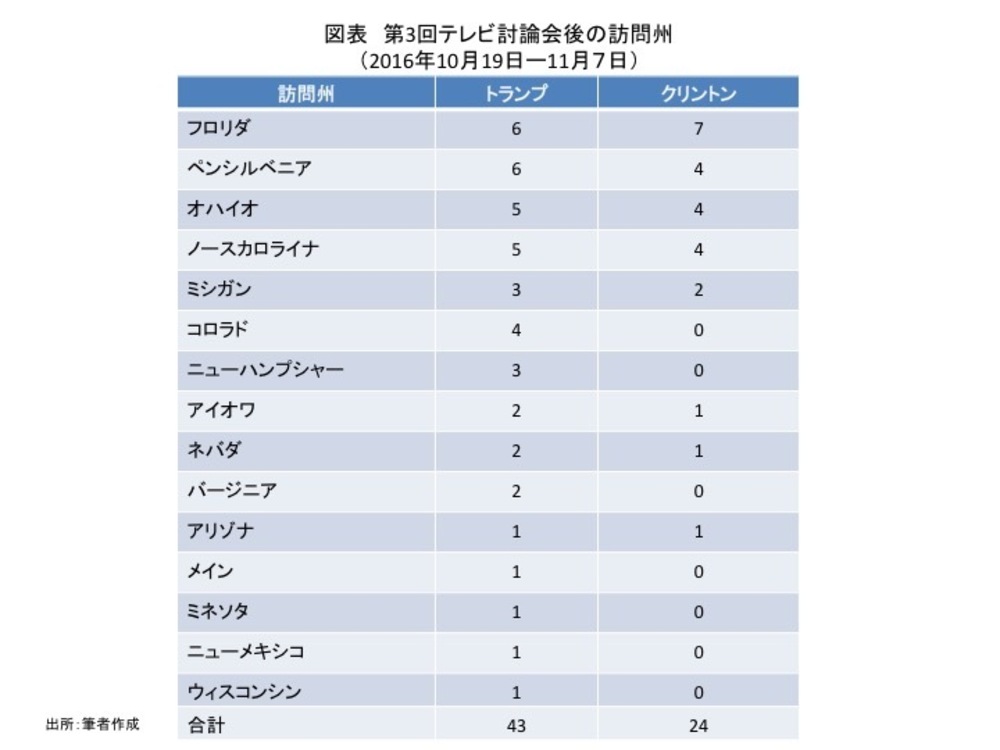 それらに加えて、最終盤における両候補の激戦州における訪問回数の相違をトランプ候補の勝因に挙げることできます(図表)。