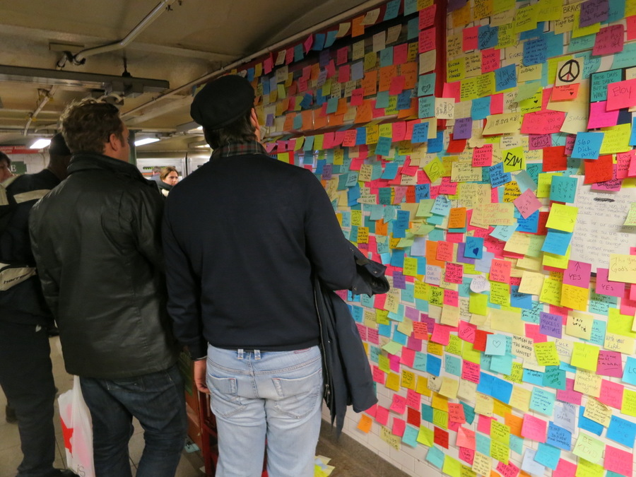 ユニオンスクエアの地下鉄駅には、行き場所のない思いを抱えたニューヨーカーたちが書いたポストイットのメモが、壁を埋め尽くして新観光地となっている。
