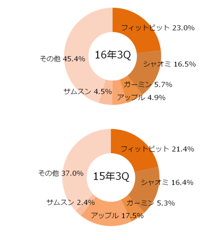 12月5日にIDCが発表した第3四半期のウェアラブル市場のメーカー別の数量シェアでは、フィットビットがトップの座を守っている。市場全体では2015年が対前年で+72%の成長だったが、今年の第3四半期は+3%とほぼ横ばい(2300万台)になっている。新製品(AppleWatch2)の発売を控えたアップルの落ち込みが大きい。フィットビットは480万台(15年第3四半期)から530万台に+10%伸びている。