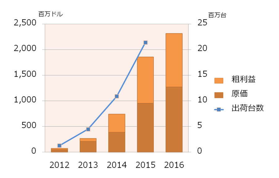 11月に発表された第3四半期の決算資料などを元に、その後の業績の推移をグラフに追加した。2016年の売上げは同社予測、1-9月実績の粗利率45.1%を用いて作成した。2015年は前年に対して+150%の成長だったが、今年は+25%程度の成長に止まる見込みだ。