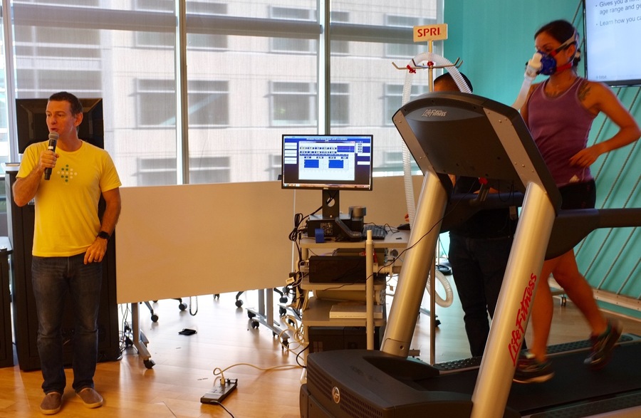 通常、VO2マックスの測定には鼻と口をマスクで覆い、疲れ果てるまでトレッドミル上を走って吸気と呼気の量を測定する必要がある。 Fitbit Charge2のソリューションは少ない労力で、その推定値を求めることができるという。フィットビットは、それをもとに年齢や性別からユーザーの運動レベルを評価し、スコアを改善するためのポイントをアドバイスする。