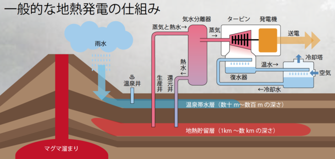 地下1kmから数kmのところに広がる地熱貯留層に向かって井戸(生産井)を掘り、高温・高圧の蒸気と熱水を得る。蒸気は勢いよくタービンを回して発電し、熱水は別の井戸(還元井)から地下の貯留層へ返す。要するに、火力発電所のボイラーの役目を、地球にやってもらうのだ。