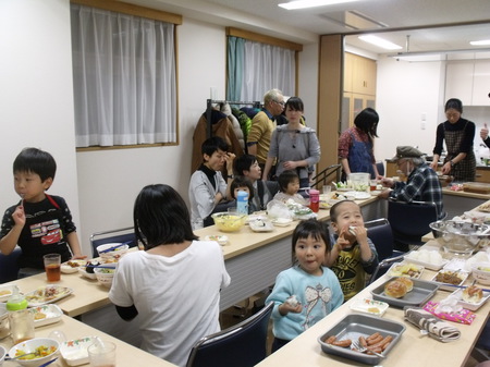 サンドイッチのためのロールパンに切れ目を入れ、ジャーマンポテトのためのジャガイモの皮を剥き、ポトフのためにニンジン、ブロッコリーを切る。その間、母親、父親が食材を持ちより、子供を連れて三々五々集まってくる。一人子が多い。足りない食材は誰かが買いに出る。父親、母親が台所に立つ。小学生の女の子が一人いて、手際良く手伝ってくれる。父親が手作りのキーマカレーを持参し、一人で参加している女性が煮しめを差し入れてくれる。すべてが自然の流れである。仕事も負担もあうんの呼吸で参加者がそれぞれ分け会う。