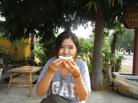 12月16日。パガンのゲストハウスで朝食を食べようとオープン・カフェのテーブルを見ると満席であった。一人の東洋系の少女と目が合ったので挨拶して相席をお願いした。その少女が韓国ソウル市在住の大学生アナ、19歳であった。小柄な彼女は好奇心に満ちており積極的に話しかけてくる。小動物のような愛くるしい表情だ。オジサンは彼女を“韓国の孫娘”と密かに心の中で命名した。