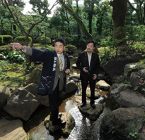 本間さん(左)の案内で園内めぐり。「庭もいいけど、この法被(はっぴ)がまたいいね」と山下さん