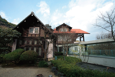 門を入って広場を進むと、イギリス風山荘の建物があった。じっと見ていて飽きない建物だ。ここは美術館の名が示すように、美術品を収蔵展示する館である前に、大山崎山荘という建物そのものが、観賞の対象としてあるようだ。建築の知識はないにしても、物として、風景として見ていて飽きない。急勾配の屋根と高い煙突が特徴で、それがいくつか複雑に組合わさって、その組合わせの流れが気持いい。この山麓の空気の中に、うまい具合に収まっている。