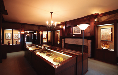 もともと美術館として建てたものではないので、絵をたくさん展示するには無理がある。でも陶芸品なら展示ケースも家具として溶け込みやすく、違和感はない。並ぶのは河井寛次郎、濱田庄司、バーナード・リーチなどが中心で、壺や皿や鉢などいろいろ。陶芸の、とくに釉薬による絵つけなどは、瞬間的な迷いのない筆致が命なので、モダンなデザインの中にも和風の感覚が発散されている。