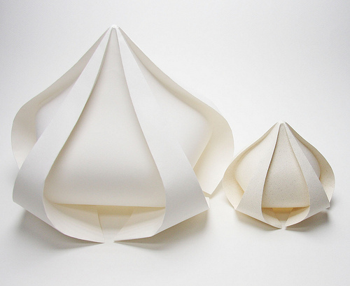 先日、自分で作っているところを撮影してyoutubeにアップしてみたんですが、それを見ていただくと、最後の最後にパッと形が仕上がるのがよくわかります(http://www.youtube.com/v/8PrXOm2QS5o&hl)。最終的な形に至るまでは紙に無理をさせることになるんですが、最後は無理なく安定するようになっています。そういうふうに展開図を作っていますから。