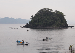 龍馬のお仲間が現れても不思議ではなさそうな町並みを抜け、海辺にいく。世界一小さな休火山という説もある笠山のある半島。緑の美しい一帯。そのすぐ前で海士(あま。男性の海女)が小舟を操りつつ、潜ってはウニを取っている。