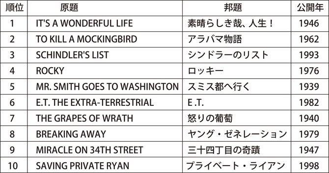 全米映画協会(AFP)百年百選「Cheers(最も感動した)」部門ランキング(うち10位まで)