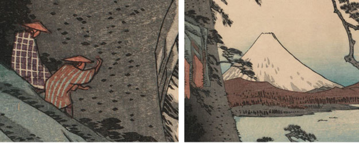山が海へせり出すような地形で、海岸の道は荒波にさらわれるくらいの危険な場所として、東海道の中でも1、2を争う難所でした。一方、富士山と駿河湾が一望のもとに見渡せる(②)峠越えの道は、またとない人気のビューポイント。旅人たちはおっかなびっくり、この絶景を楽しみました(③)。峠から眺める富士山の右肩には、宝永4年(1707)に起きた宝永大噴火の大きな火口、「富士山のえくぼ」が見えるはずですが、広重さんはあえてきれいな富士山のスロープを描いています。