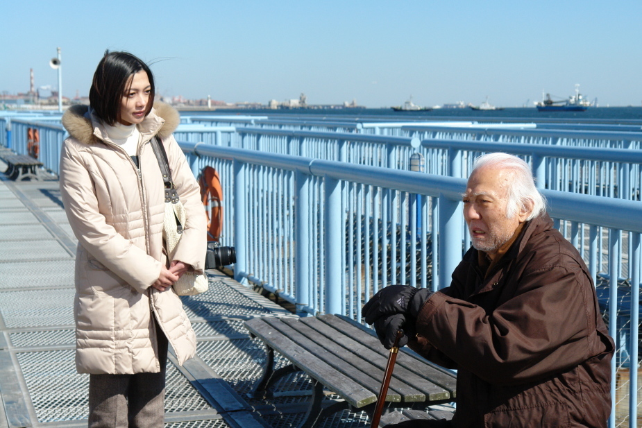 八名信夫は介護施設で暮らす“桟橋の老人”を好演。左は遠藤久美子演じる新聞記者・馬場久子(「3つの港の物語」より 写真提供:横浜アートプロジェクト)