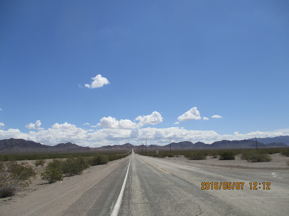 5月7日(土)。カリフォルニア州のアリゾナ州境の町Needlesからルート66旧道を西進。このあたりは年間降雨量が少なく灌木や多少の草地もあるが大半は土漠である。南部にはモハベ砂漠が広がっている。昼頃にEssexという地名の集落に差し掛かった。