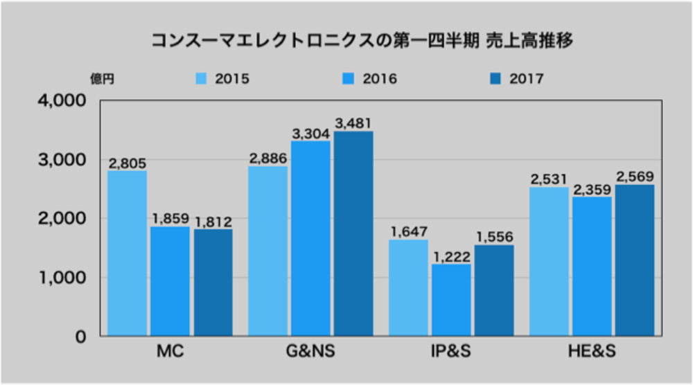 ソニーのコンスーマーエレクトロニクスの事業セグメントは、スマートフォンを中心とするモバイル・コミュニケーション(MC)、ゲーム&ネットワークサービス(G&NS)、デジタルカメラなどのイメージング・プロダクツ&ソリューション(IP&S)、テレビを含むホームエンターテイメント&サウンド(HE&S)からなります。中期計画の期間における、コンスーマーエレクトロニクスの事業セグメントの第一四半期(4月~6月)の売上高の推移をグラフにして眺めてみましょう。