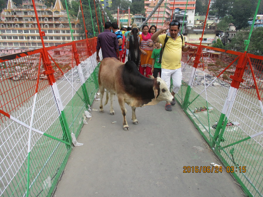 駅からバス、オートリキシャ(オートバイと人力車を組み合わせたような乗り物)を乗り継いでリシュケシに到着。聖地はヒンズー教徒と神聖なる牛が狭い道に溢れており、例によってゴミが散乱、埃っぽく、悪臭が漂っている。
