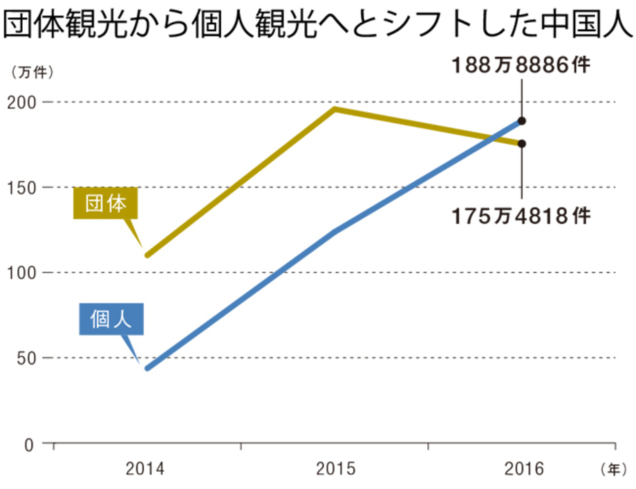 そこで中国で起きているのが個人旅行ブームだ。日本を訪れる中国人の数も2014年の240万人から2016年には637万人と約2.5倍に急増しており、昨年には初めて、中国人への個人観光ビザの発給数が団体観光ビザを上回った。