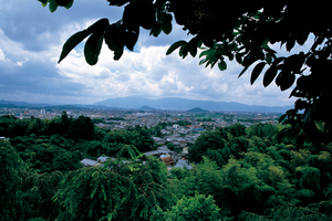 大美和の杜展望台からの眺め。手前に見えるのが大和三山で、左から天香具山、畝傍山、耳成山