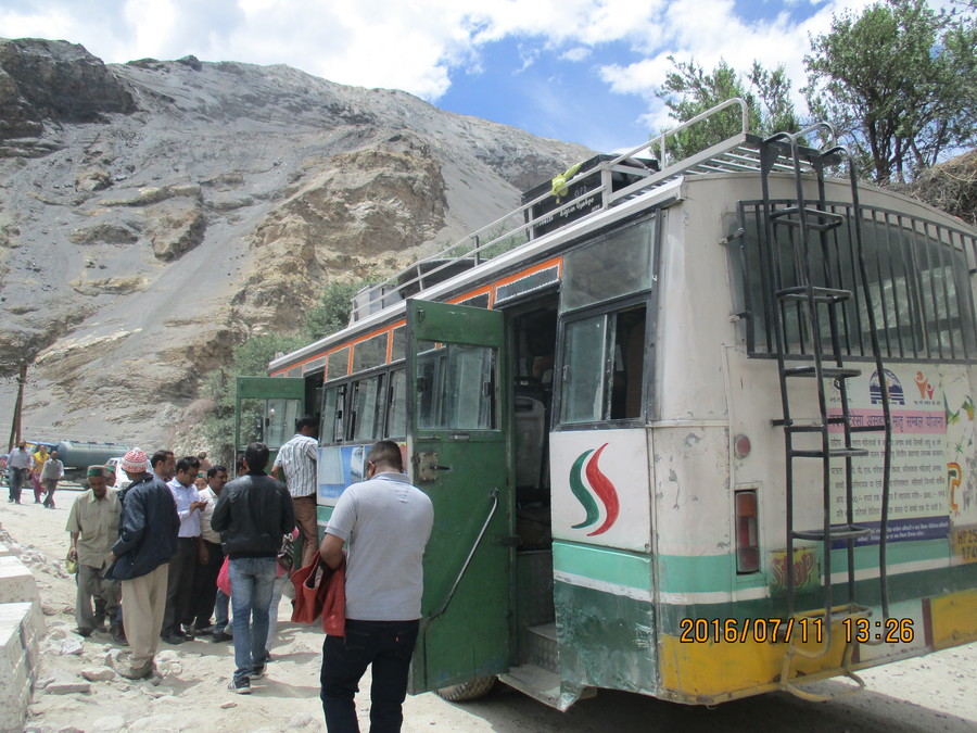 7月11日。ナコからさらに北に位置する中国国境のタボに移動。インドのローカルバスではおなじみタタ社製の旧式大型バスである。標高3000~4000メートルの高度を大半が未舗装の道路が続く。眼下の遥か下にはスピティー渓谷の茶色い濁流が渦巻いている。このスピティー川の激流に削られた荒々しい渓谷の急峻な山道を気息奄々とローカルバスは進む。