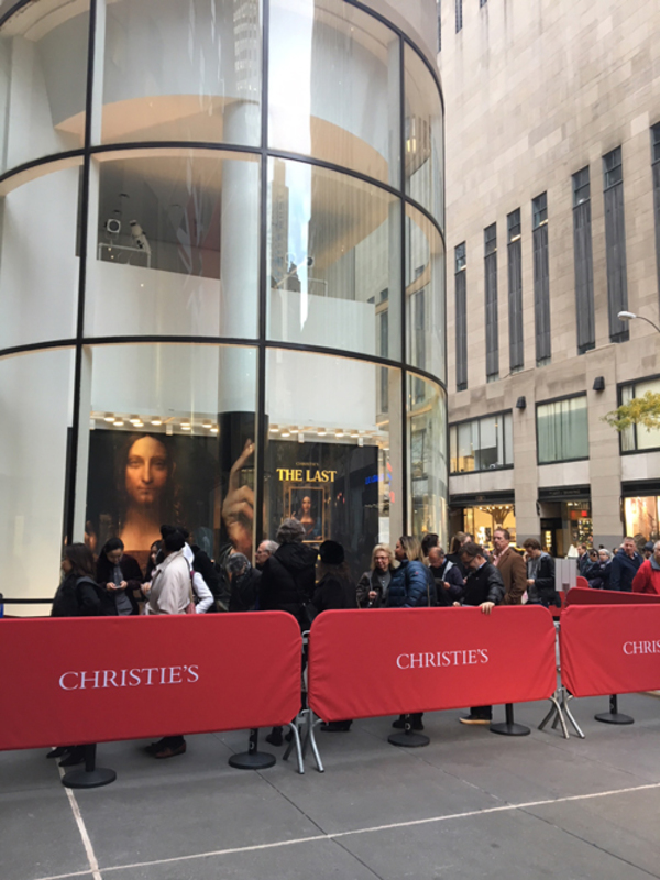ロックフェラーセンターにあるクリスティーズの前には、専用のラインが作られて守衛が立っていた。列は思ったほどの長さでもなく、待ち時間は20分ほどで中に入ることができた。入ってまず正面に飾ってあるのは、同じ日に競売にかけられるアンディ・ウォーホールの「最後の晩餐」をモチーフにした作品「シクスティ・ラストサパーズ」である。