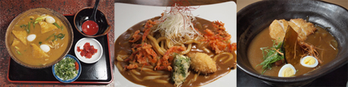 豊橋カレーうどんは、店によって、異なる味が楽しめることも大きな魅力。左から、勢川 本店、十勝庵、玉川うどん 豊橋広小路本店