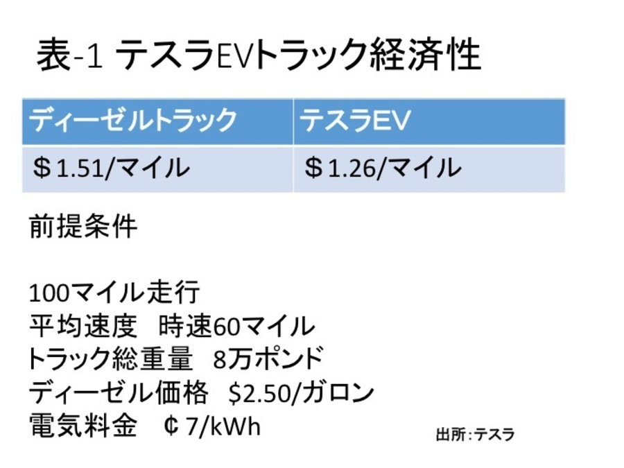 ディーゼル車との比較では、1マイル当たりのコストがディーゼル車の1.51ドルに対し、EVトラックは1.26ドルと説明されたが、その前提は表-1の通りだった。