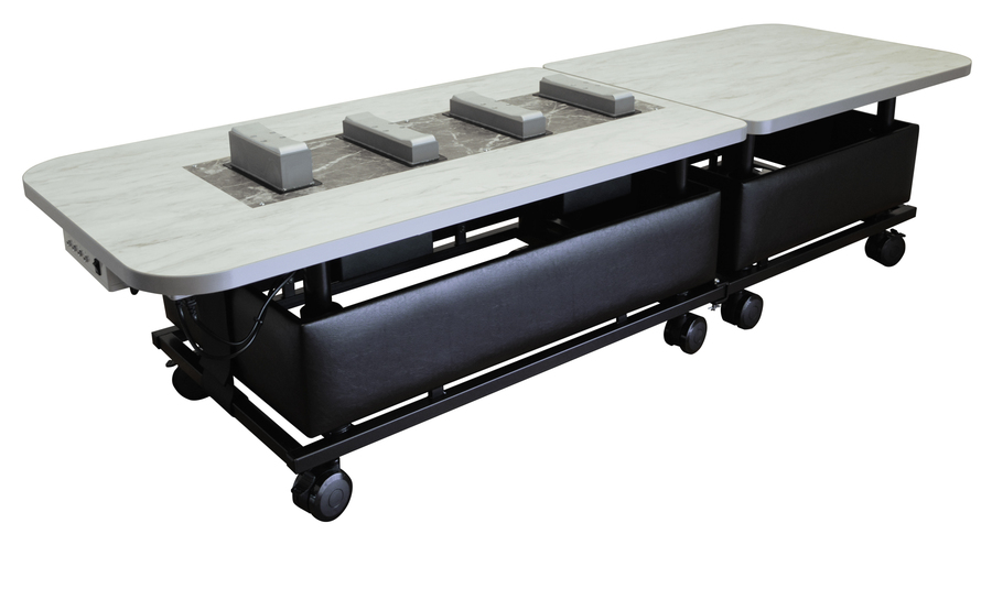 見た目は、直方体の突起が4つならんだベッド。この4つの直方体は何であろうか? 「ペルチェ素子」だ。ペルチェ素子は、その原理を発見したフランスの物理学者 ジャン=シャルル・ペルチェから、その名前をもらっている「熱移動素子」だ。家電では、小型のワインクーラー等に使われている。ただこのペルチェ素子、素子単体ではそれほど冷却力が強いものではない。そこで特殊加工したアルミブロックや、ヒートシンク、ファンなどを組み合わせる(特許技術)ことによって冷却能力を最大に引き出している。
