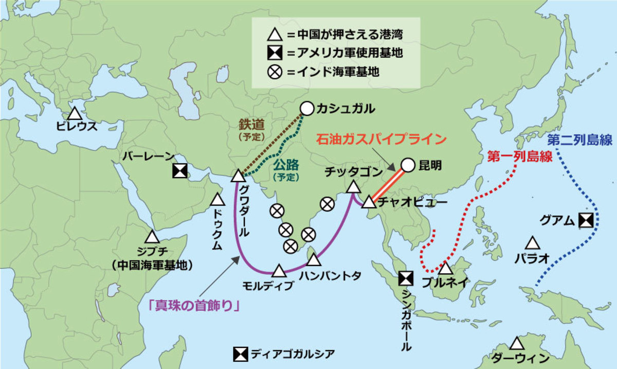 ここで一帯一路の現状を地図上に記して見ると、海洋では南太平洋からギリシャまで、中国はいくつかの主要港を押さえてしまった。パラオまで手中に収めたことで、第一列島線の外側に拠点を持った。グアムは指呼の間に在る。ブルネイは南シナ海での動きを容易くする働きを持つだろう。インドの主要軍港は中国の唱える「真珠の首飾り」で遠巻きに押さえられていることから、インド洋有事の際、アメリカ軍の動きは制限されるに違いない。陸上では、昆明を起点にミャンマーのチャオピューがパイプラインで結ばれ、ラオス経由でバンコクを結ぶ鉄道は紆余曲折を経たが建設に向け動き出した。カシュガルとパキスタンのグワダールもまた建設に向け動き出す可能性を考慮しておくべきだろう。