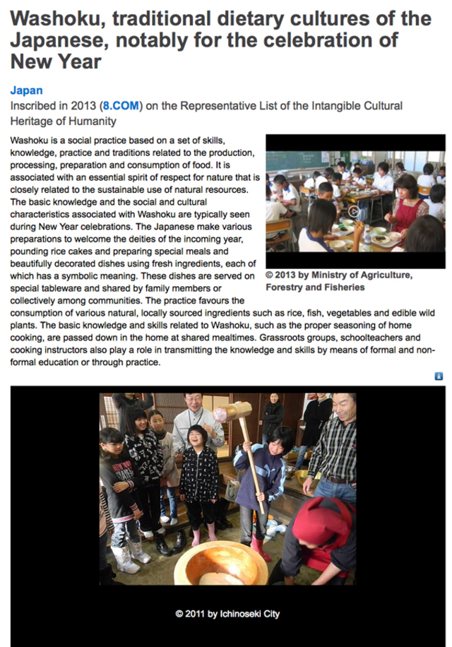 松永:ユネスコの公式ウェブサイト(英語)で今、調べました。世界無形遺産リストの中の和食紹介のページ https://ich.unesco.org/en/RL/washoku-traditional-dietary-cultures-of-the-japanese-notably-for-the-celebration-of-new-year-00869 に、健康を意味する説明は一言もありません。米や魚、野菜などナチュラルでローカルな材料が使われていることなどには触れられています。ダウンロードできる決定文書では、promoting healthy eating とのみ書かれています。一方で、農水省の公式ウェブサイトの中にある「和食が世界無形遺産に登録されました!」http://www.maff.go.jp/j/keikaku/syokubunka/ich/ というページを見ると、和食の特徴として、「多様で新鮮な食材とその持ち味の尊重」の次に「健康的な食生活を支える栄養バランス」を挙げています。ユネスコのページ、文書にはない意味合いが付け足されている。なんだ、私たちは農水省にだまされていたのか。