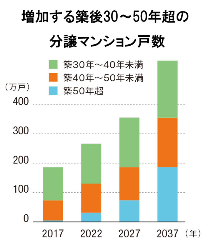 国土交通省によると、2017年末のマンションストック総数は644万1000戸で、居住人口は1533万人と推計され、国民の約1割に当たる。そのうち、築40年以上の老朽マンションは72万9000戸あり、全体に占める割合は約1割だが、10年後には2・5倍の184万戸、20年後には5倍の351万戸と爆発的に増える。