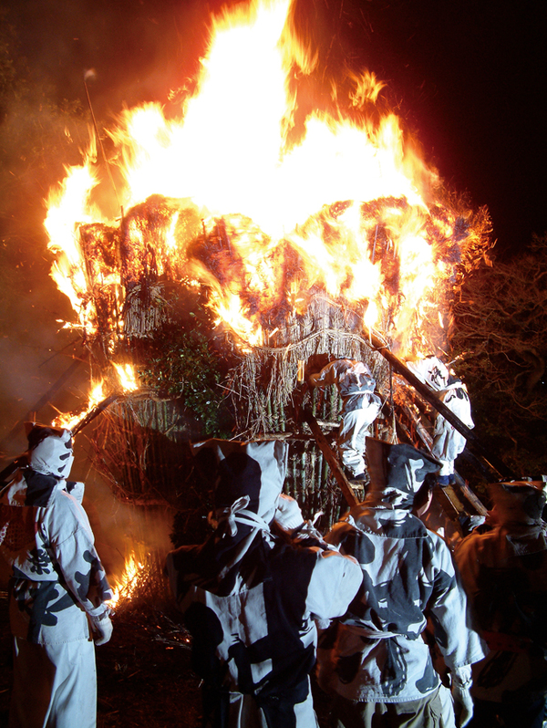 祭りが最高潮となるのが、古い幟(のぼり)で作った衣装を身に着けた奉仕者、通称「ネコ」が、すずみに架けた梯子を上って、燃え盛る炎の中に何度も飛び込んでいく場面だ。すずみの中心に納められた「神木(しんぎ)」と1年を表す「十二縄」が炎の中から取り出され、神前に供えられる。すずみの燃え方や、どちらの地区が先に取り出したかで、その年の天候や豊凶が占われる。